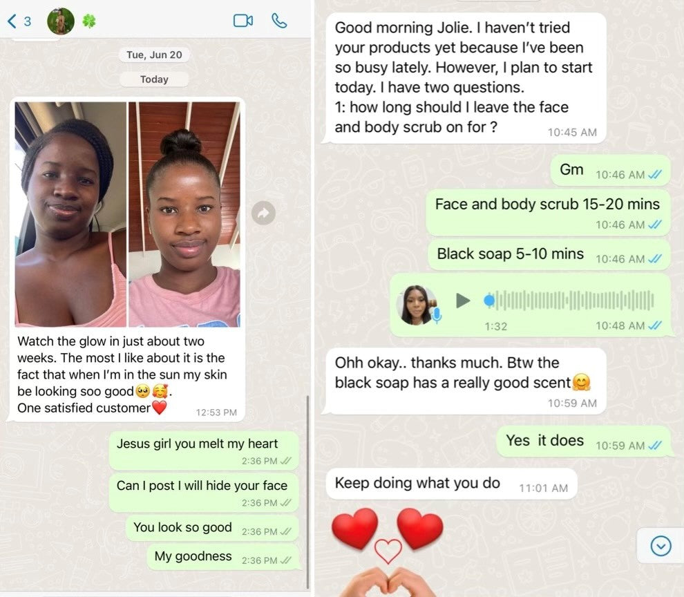 Introducing our Radiant Glow Hot Chocolate Kit, designed to give you smooth, radiant brown skin. This kit not only enhances your complexion but also promotes skin healing, fades spots, repairs damaged skin, and much more. For personalized recommendations and assistance, feel free to reach out to us at 346-459-9779 both via call and WhatsApp. Say goodbye to the struggle of finding the right skincare products and hello to glowing, healthy brown skin with Julie’s Glow Skincare!
