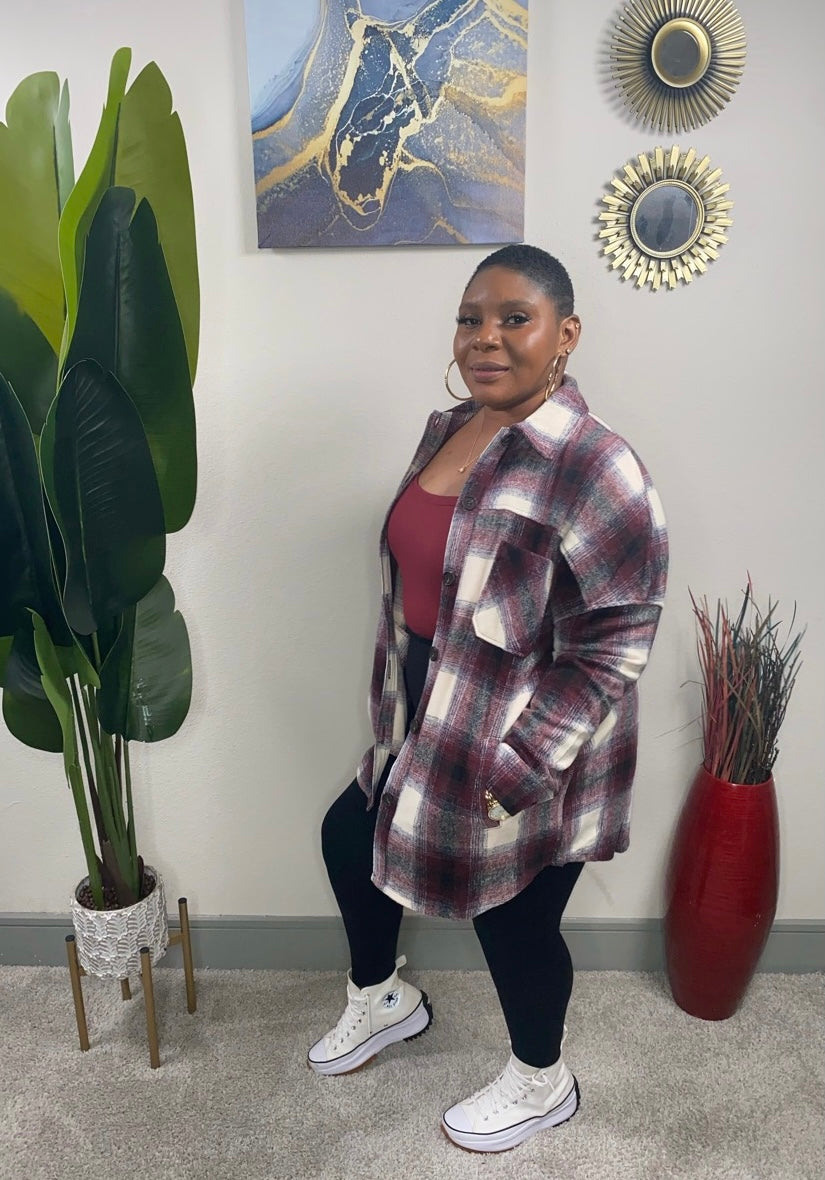 Legging, Black tank top and long sleeve plaid Shacket Shacket has pockets on both sides